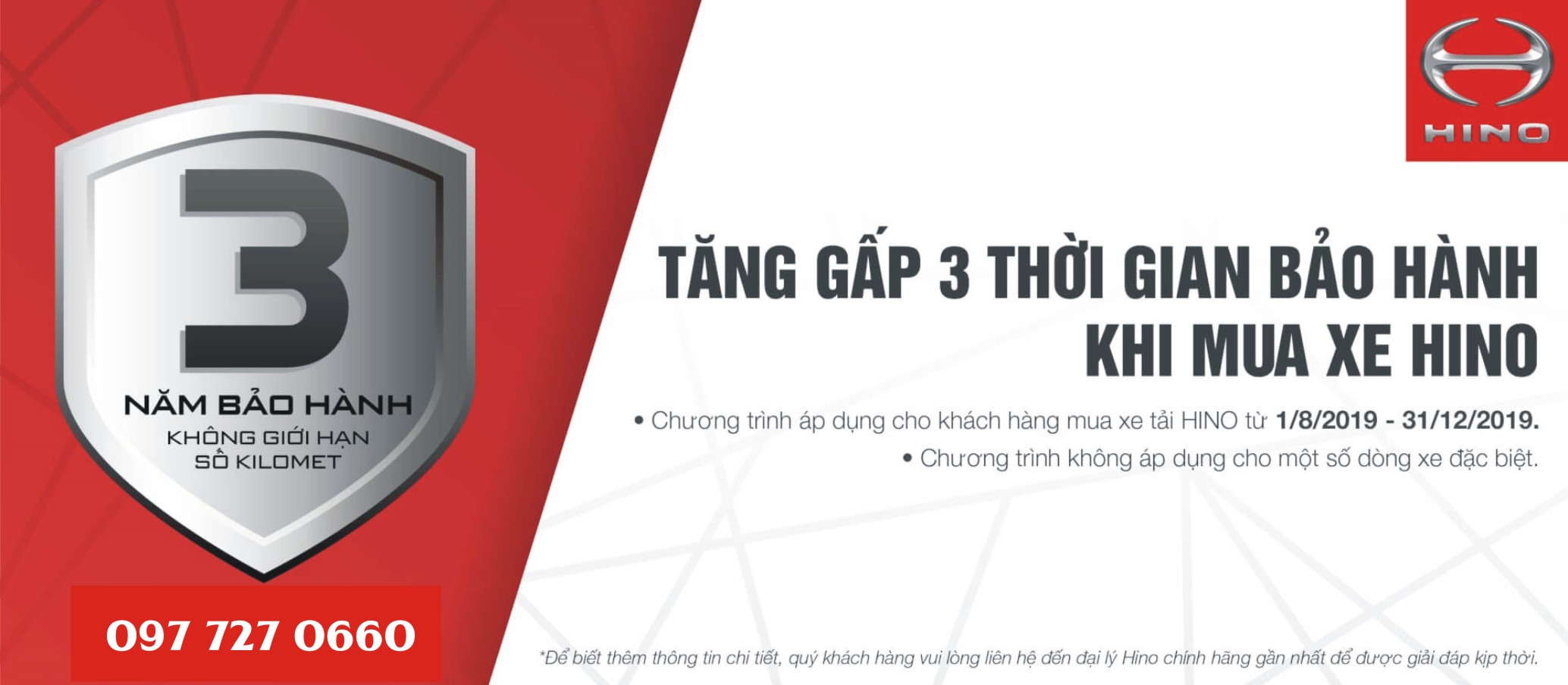 1. Nội dung chương trình: Bảo hành đặc biệt 3 năm và không giới hạn số km sử dụng cho tất cả xe có số Vin 2019 ( xe đời 2019) lắp ráp tại nhà máy Hino Motors Việt Nam
